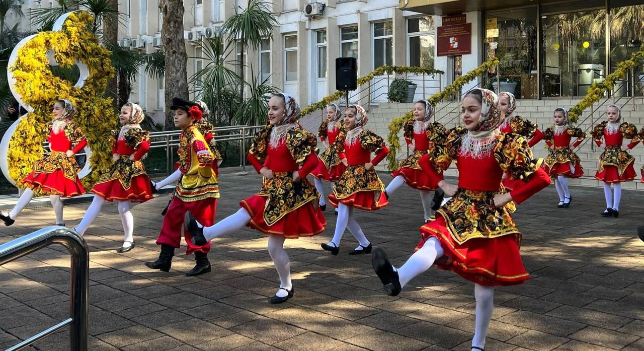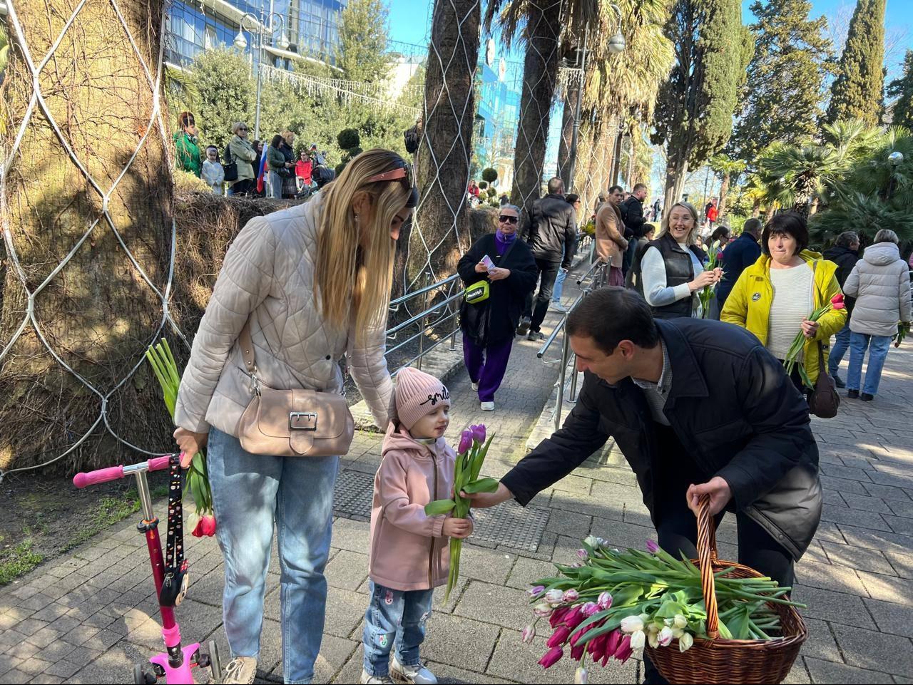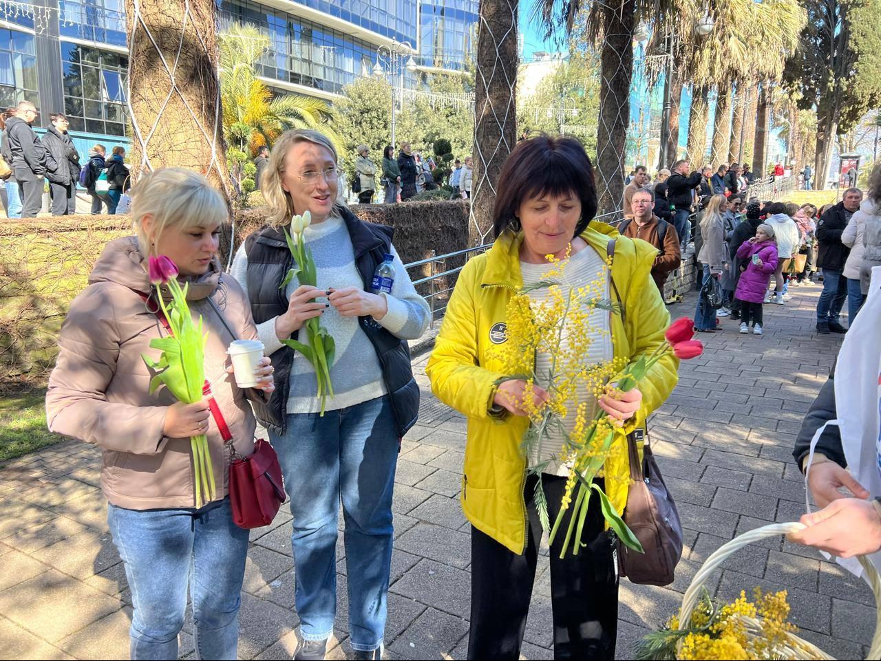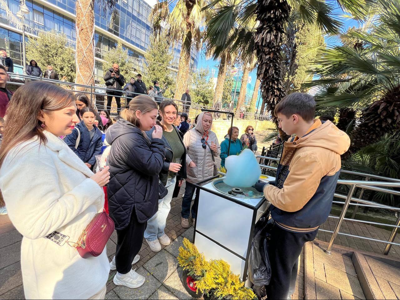 Для жителей и гостей курорта оформлена фотозона из живых мимоз. Все желающие делают фото на память о праздничном дне.
